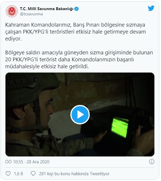 MSB'nin Twitter açıklamasında, kahraman komandoların başarılı bir müdahaleyle Barış Pınarı bölgesine sızma girişiminde bulunan 20 20 PKK/YPG'li teröristin daha etkisiz hale getirildiğini belirtti.