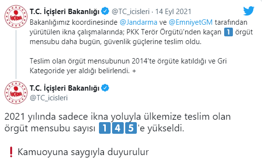 2021 yılında sadece ikna yoluyla ülkemize teslim olan örgüt mensubu sayısı 145'e yükseldi.