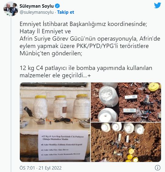 Süleyman Soylu, Afrin'de eylem yapmak üzere PKK'lı teröristlere Münbiç'ten gönderilen 12 kg C4 patlayıcı ile bomba yapımında kullanılan malzemelerin ele geçirildiğini açıkladı.