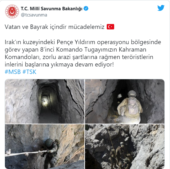 Milli Savunma Bakanlığı'nın Twitter hesabından yapılan açıklamada, "Vatan ve bayrak içindir mücadelemiz. Irak'ın kuzeyindeki Pençe Yıldırım operasyonu bölgesinde görev yapan 8'inci Komando Tugayımızın kahraman komandoları, zorlu arazi şartlarına rağmen teröristlerin inlerini başlarına yıkmaya devam ediyor" denildi.