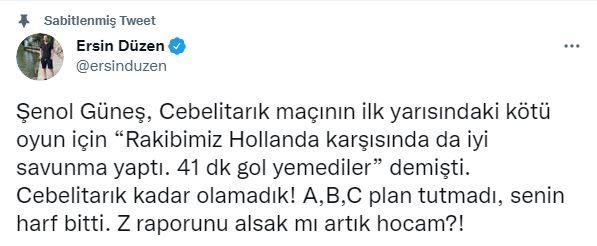 Hollanda - Türkiye maçı 3-0 iken bir tweet atan Ersün Düzen; "Şenol Güneş, Cebelitarık maçının ilk yarısındaki kötü oyun için "Rakibimiz Hollanda karşısında da iyi savunma yaptı. 41 dk gol yemediler" demişti. Cebelitarık kadar olamadık! A,B,C plan tutmadı, senin harf bitti. Z raporunu alsak mı artık hocam?!" ifadelerini kullanmıştı.