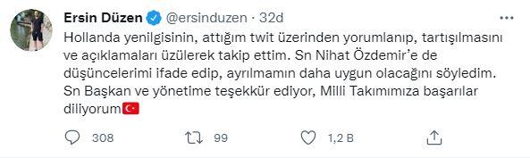 "Hollanda yenilgisinin, attığım twit üzerinden yorumlanıp, tartışılmasını ve açıklamaları üzülerek takip ettim. Sn Nihat Özdemir’e de düşüncelerimi ifade edip, ayrılmamın daha uygun olacağını söyledim. Sn Başkan ve yönetime teşekkür ediyor, Milli Takımımıza başarılar diliyorum."