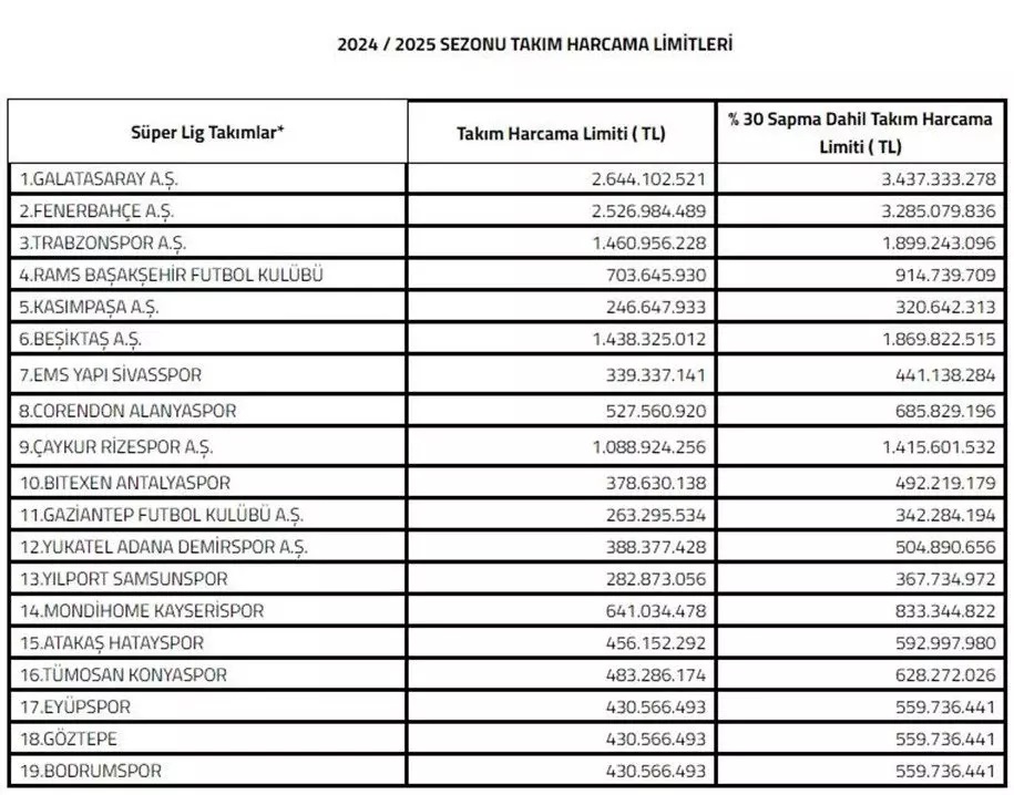 Fenerbahçe'nin harcama limiti ise yine yüzde 30 sapma payıyla 3 milyar 285 milyon 79 bin TL.