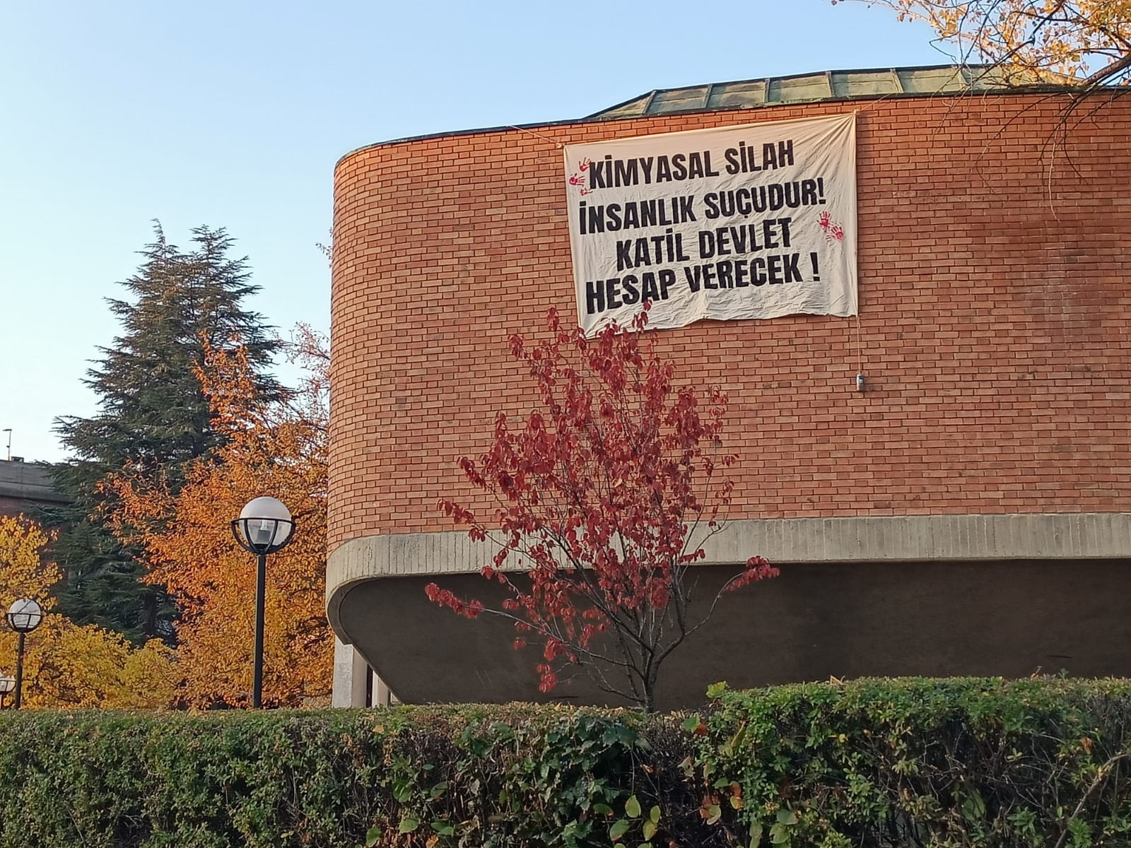Orta Doğu Teknik Üniversitesi'nde 'ODTÜ Forum' isimli oluşum, HDP'nin ve TTB Başkanı Şebnem Korur Finacancı'nın kimyasal silah yalanına destek olmak için bir pankart astı.