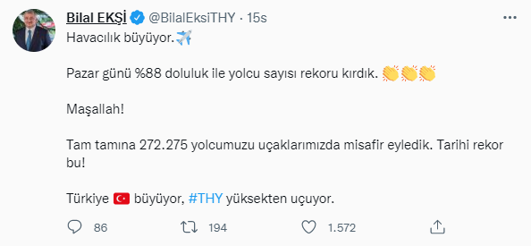 Türk Hava Yolları (THY) Genel Müdürü Bilal Ekşi, sosyal medya hesabından yaptığı paylaşımda THY'nin ulaştığı tarihi doluluk oranına değinerek, "Havacılık büyüyor. Pazar günü yüzde 88 doluluk ile yolcu sayısı rekoru kırdık. Maşallah. Tam tamamına 272.275 yolcumuzu uçaklarımızda misafir eyledik. Tarihi rekor bu. Türkiye büyüyor, THY yüksekten uçuyor" ifadelerini kullandı.