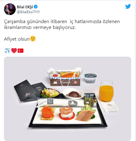 Ekşi, "Çarşamba gününden itibaren iç hatlarımızda özlenen ikramlarımızı vermeye başlıyoruz, afiyet olsun" ifadelerini kullandı.