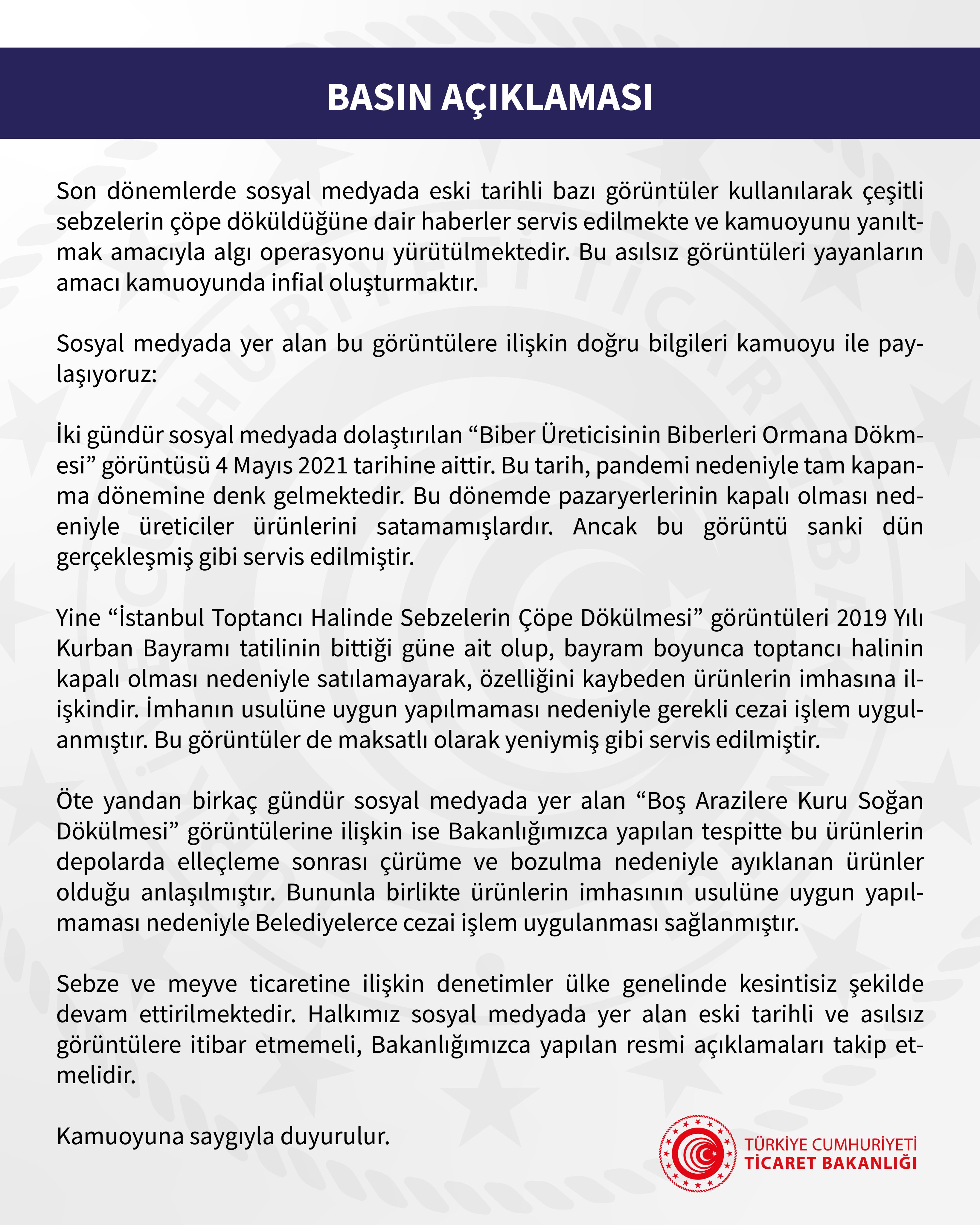 Yine "İstanbul Toptancı Halinde Sebzelerin Çöpe Dökülmesi" görüntüleri 2019 Yılı Kurban Bayramı tatilinin bittiği güne ait olup, bayram boyunca toptancı halinin kapalı olması nedeniyle satılamayarak, özelliğini kaybeden ürünlerin imhasına ilişkindir. İmhanın usulüne uygun yapılmaması nedeniyle gerekli cezai işlem uygulanmıştır. Bu görüntüler de maksatlı olarak yeniymiş gibi servis edilmiştir.
