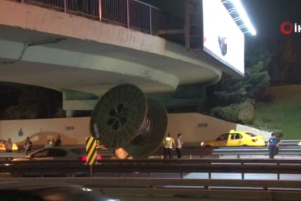 Kaza, bu akşam saat 22.15 sıralarında E-5 Ankara istikameti Bakırköy mevkiinde yaşandı. Üzerinde iki tane dev kablo makarası bulunan tırdaki makaralardan biri Ataköy köprüsüne takılarak yola düştü ve köprünün altında sıkışıp kaldı.
