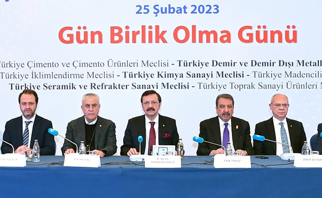 Hisarcıklıoğlu, "İnşaat malzemeleri üreten 7 sektör meclisimizle bir araya geldik. Oda ve borsalarımız ve sektör meclislerimiz ilk günden itibaren müthiş bir seferberlik içinde hareket etti. TOBB camiası olarak 6 uçak, 7 gemi ve 3 bin 900 TIR yardım malzemesi, 41 TIR çadır, 970 konteyner, 141 seyyar mutfak, 551 iş makinesi ve mobil vincin bölgeye sevkini sağladık" dedi. Zorlu süreçte halkın ve özel sektörün dünyaya örnek olacak bir dayanışma örneği gösterdiğini ifade eden Hisarcıklıoğlu, şöyle konuştu: