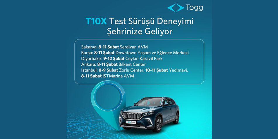 Türkiye’nin mobilite alanında hizmet veren küresel teknoloji markası Togg, 2024 yılında daha fazla kullanıcıyı T10X ile buluşturmak için çalışmalarını aralıksız sürdürüyor. 2024 yılı için 20 Ocak itibarıyla siparişleri almaya başlayan Togg, T10X için Sakarya, Bursa, Diyarbakır, Ankara ve İstanbul’da kullanıcılar için test sürüşü günleri başlattı. Kullanıcılar Togg’un sitesindeki https://www.togg. com.tr/t10x-surus-deneyimi adresinden randevu oluşturup, T10X’i daha yakından tanıma fırsatı buluyor. T10X, bu yıl çekiliş yapılmadan, sipariş sırasına, konfigürasyon özelliklerine ve bunlara bağlı üretim planlamasına göre kullanıcılara teslim ediliyor.
