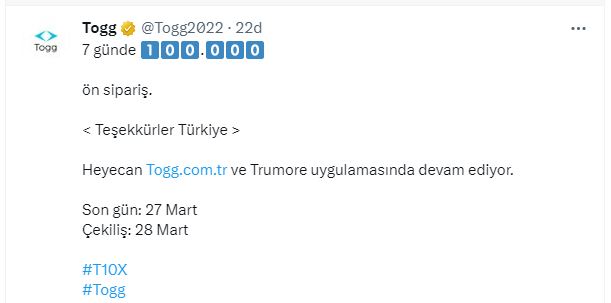 Cumhurbaşkanı Recep Tayyip Erdoğan, NTV-Star ortak yayınında Togg'un 27 Mart'a kadar 100 bin ön siparişe ulaşabileceğini açıklamıştı.
