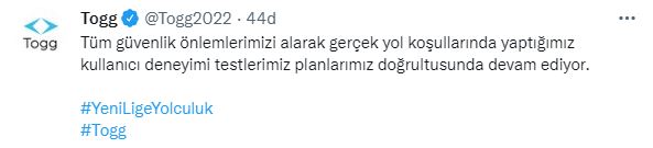 Yapılan açıklamada, ''Tüm güvenlik önlemlerimizi alarak gerçek yol koşullarında yaptığımız kullanıcı deneyimi testlerimiz planlarımız doğrultusunda devam ediyor.'' denildi.