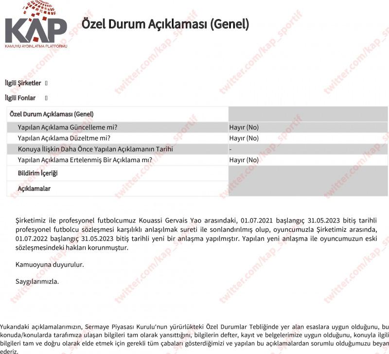 "Şirketimiz ile profesyonel futbolcumuz Kouassi Gervais Yao arasındaki, 01.07.2021 başlangıç 31.05.2023 bitiş tarihli profesyonel futbolcu sözleşmesi karşılıklı anlaşılmak sureti ile sonlandırılmış olup, oyuncumuzla Şirketimiz arasında, 01.07.2022 başlangıç 31.05.2023 bitiş tarihli yeni bir anlaşma yapılmıştır. Yapılan yeni anlaşma ile oyuncumuzun eski sözleşmesindeki hakları korunmuştur."