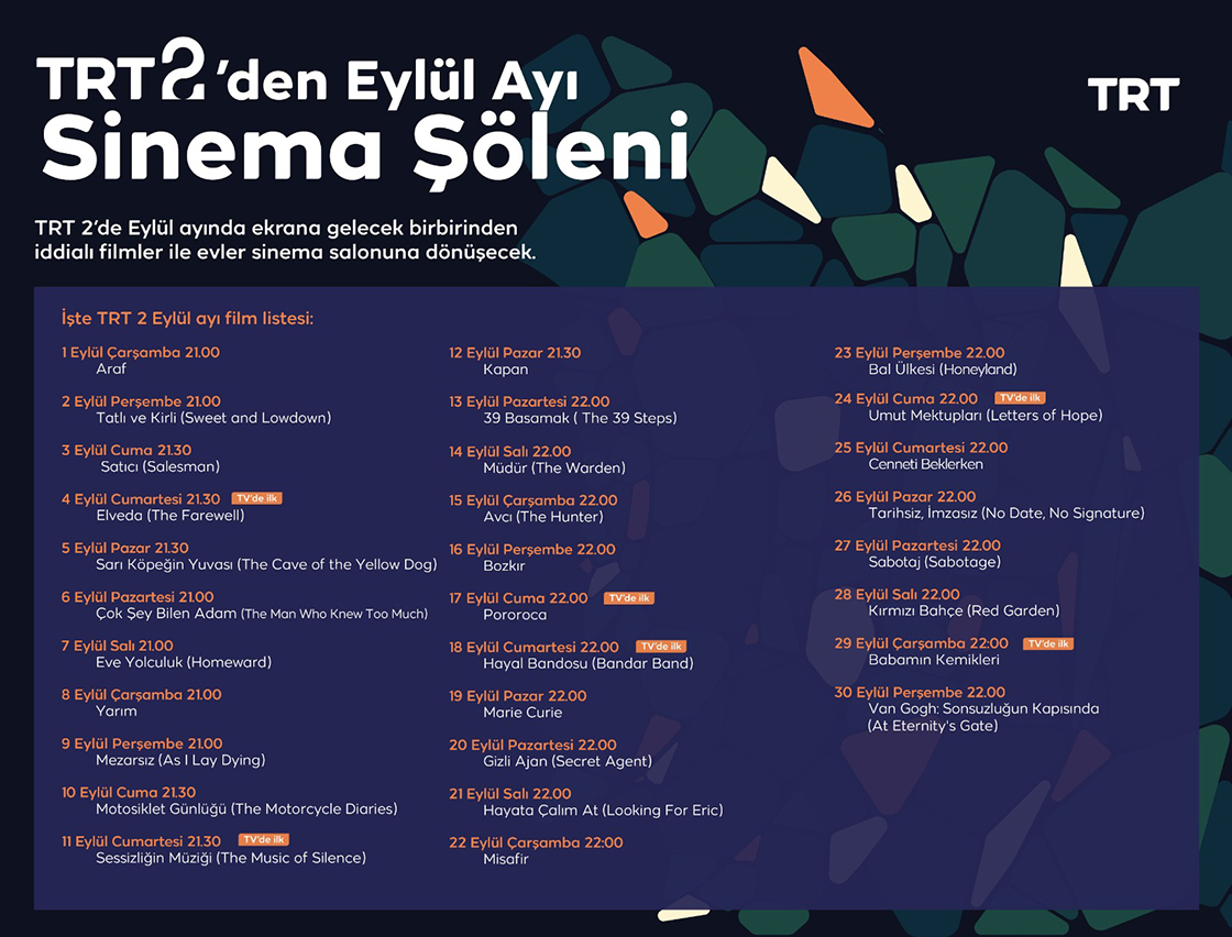 Türkiye’nin kültür sanat kanalı TRT 2’nin merakla beklenen eylül ayı filmleri belli oldu. Birçok alanda özel yapımları izleyiciyle buluşturan TRT 2, eylül ayında her akşam farklı bir filmi sinemaseverlerin beğenisine sunacak.