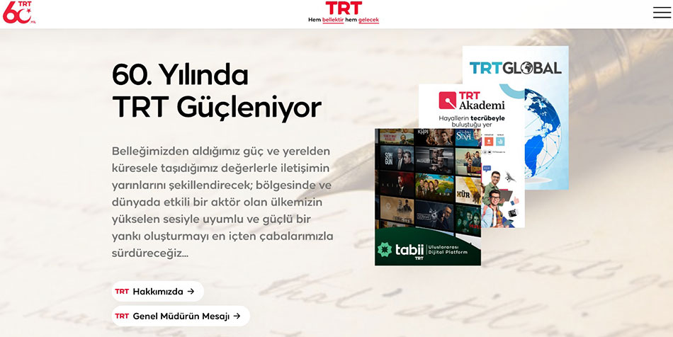 TRT’nin 60 yıllık yayıncılık yolculuğundaki ilkleri barındıran tüm projelerine ulaşılabilen trt60yasinda.com’da; ulusal ve uluslararası yayınlar, dijital uygulamalar, izlenme rekorları kıran yapımlar, eğitim alanındaki projeler de yerini aldı.