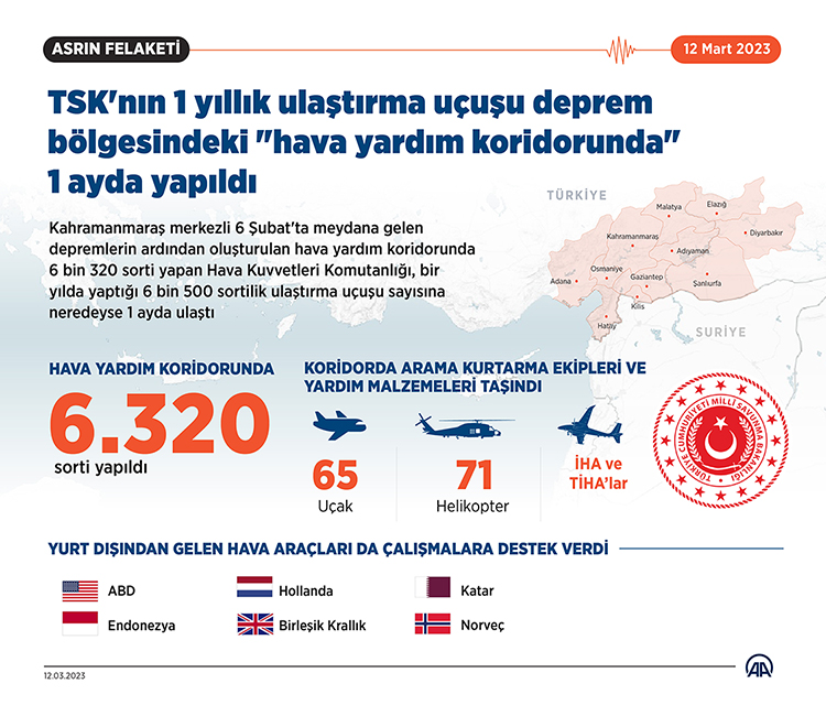 Kahramanmaraş merkezli 6 Şubat'ta meydana gelen 7,7 ve 7,6 büyüklüğündeki depremlerin ardından oluşturulan "hava yardım koridoru"nda 6 bin 320 sorti yapan Hava Kuvvetleri Komutanlığı, normal şartlarda bir yılda gerçekleştirdiği 6 bin 500 sortilik ulaştırma uçuşu sayısına neredeyse 1 ayda ulaştı.