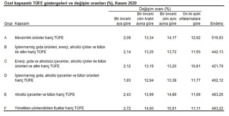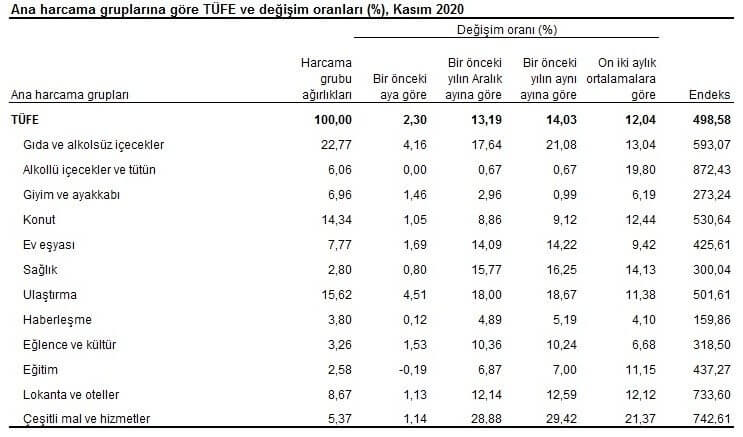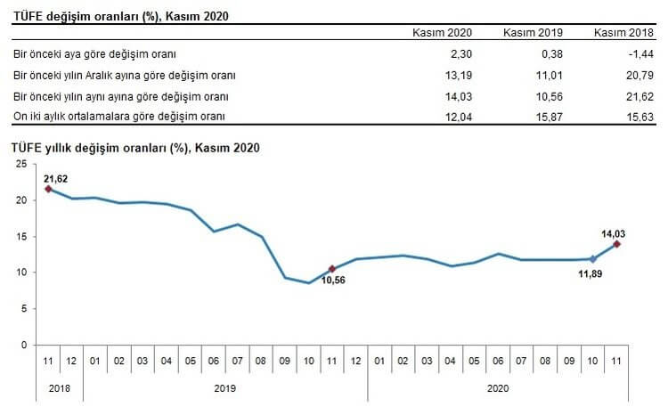 TÜFE'de (2003=100) 2020 yılının Kasım ayında, önceki ay kıyasla yüzde 2,30, bir önceki yıldaki Aralık ayına kıyasla yüzde 13,19, bir önceki yıldaki aynı aya kıyasla yüzde 14,03 ve on iki aylık ortalamaya kıyasla ise yüzde 12,04 artış yaşandı.