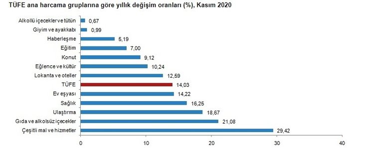 Yüzde 0,12 oranı ile haberleşme, yüzde 0,80 oranı ile sağlık grubu. Buna karşılık olarak, ana harcama grupları itibariyle, 2020 yılının Kasım ayında artış oranının yüksek olduğu gruplar da şu şekilde sıralanıyor; yüzde 4,51 oranı ile ulaştırma, yüzde 4,16 oranı ile gıda ve alkolsüz içecekler, son olarak yüzde 1,69 oranı ile ev eşyası.