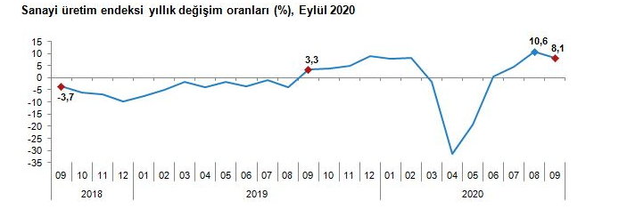 Türkiye İstatistik Kurumu (TÜİK), 2020 Eylül ayı için sanayi üretim verilerini açıkladı. Verilere göre sanayi üretiminin aylık ve yıllık oranında artış olduğu belirlendi. Sanayi üretimi, aylık olarak yüzde 1,7 oranında, yıllık olarak ise yüzde 8,1 oranında yükseldi. TÜİK, ekonomide çarkların döndüğünü açıkladı.