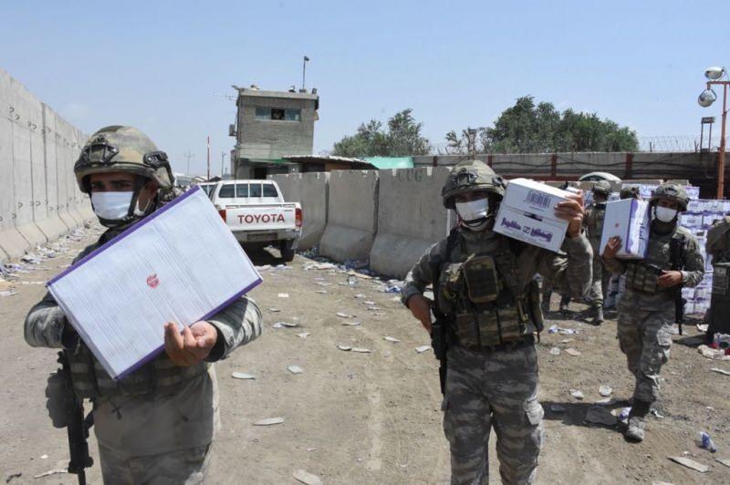 Türk askeri, ülkeden ayrılmak için havalimanının önünde günlerdir zor şartlarda bekleyenlere yardımcı olmaya devam ediyor.