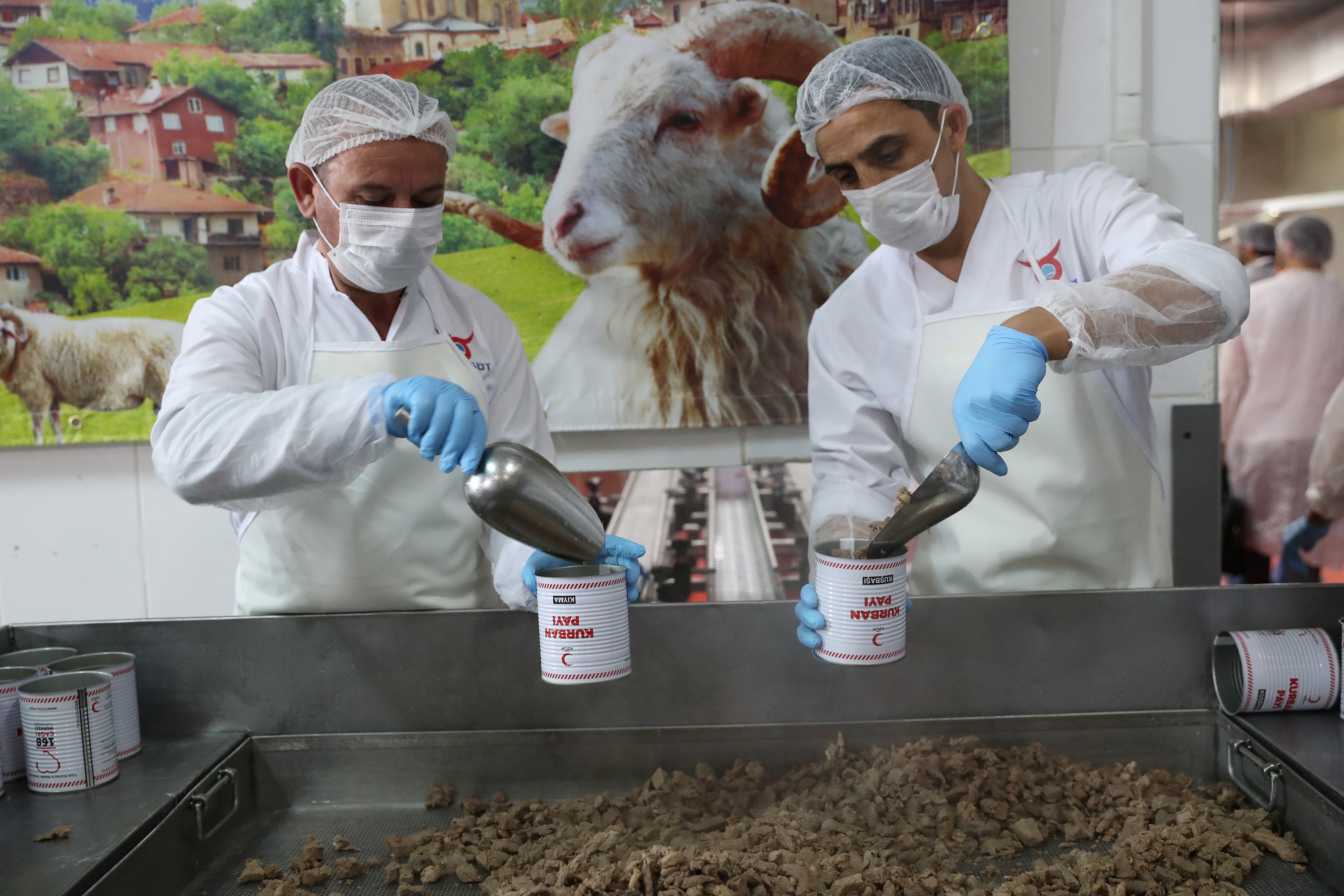 Kesilen kurbanları ilk önce ihtiyaç sahibi ailelere et olarak dağıtıldığı gibi, kalan kısımları da 800 gramlık konserve kutularında ve hijyenik ortamda depolarda muhafaza etiklerini söyleyen Demirel, “Yıl içerisinde bu etleri periyodlarla şubelerimizin aracılığıyla ihtiyaç sahiplerine konserve kutu şeklinde dağıtıyoruz. Ayrıca 4 kutuluk konserve kutularımızı da aşevlerimizde kullanıyoruz. 41 ildeki aşevlerimizde coğrafi patent almış yöresel yemeklerimizi de yapmaktayız. Yöresel yemeklerimizde kesilen kurban etlerimizi de kullanıyoruz. 4 kiloluk kurban konservelerimizi 41 aşevimizde günlük olarak 50 bin kişilik yemeklerde kullanıyoruz. Yıl boyu sürekli bu yemekleri sefer taslarında ihtiyaç sahiplerinin önüne kadar götürüp dağıtıyoruz. 3 çeşit yemeği her gün düzenli bir şekilde ihtiyaç sahibi ailelere ulaştırıyoruz” ifadelerinde bulundu.