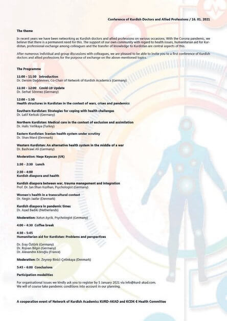 PKK'nın Almanya'da bulunan yapılanması olarak faaliyet halinde olan derneğin sosyal medya hesaplarından Kürtçe, Almanca ve İngilizce bilgilendirme duyuruları paylaşılıyor. Buna göre, konferansın 16 Ocak 2021 tarihinde çevrimiçi olarak gerçekleştirileceği ve TTB'nin Merkez Konsey Üyesi Uzm. Dr. Halis Yerlikaya'nın,"Kuzey Kürdistan: Dışlanma ve Asimilasyon Bağlamında Tıbbi Bakım" başlığı altında konuşma yapacağı açıklandı.