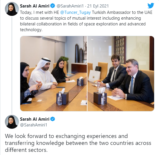 Birleşik Arap Emirlikleri'nin (BAE) İleri Teknolojilerden Sorumlu Devlet Bakanı Sarah Al Amiri ile Türkiye'nin BAE büyükelçisi Tugay Tunçer arasında bir görüşme gerçekleşti.