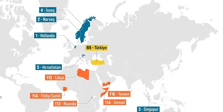Söz konusu listede küresel bazda 6 yıl üst üste birinci olan Hollanda bu yıl da 636 puanla birinci sıradaki yerini korurken, geçen yıl beşinci sırada yer alan Norveç 610 puanla ikinci ve Singapur 609 puanla üçüncü sırada yer aldı. 608 puanla İsveç ve 607 puanla da Hırvatistan ilk beşe yerleşti. Geçen yıla göre en yüksek puan artışını ise küresel sıralamada 112. sıradan 109. sıraya çıkan Tacikistan gösterdi.