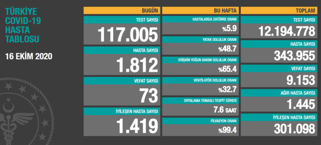 16 Ekim tarihinde 117 bin 5 adet test yapıldı ve bunlardan 1812 kişinin koronavirüse yakalandığı belirtildi. Vefat sayısı 73 kişiye yükseldiği belirtilirken, 1419 kişinin de hastalığı alt ettiği vurgulandı.