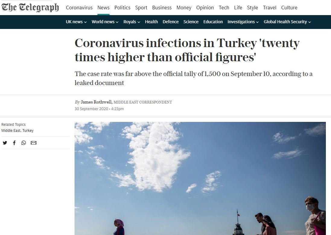 İngiltere'deki Telegraph gazetesi, "Türkiye'deki koronavirüs vaka sayısı, açıklanandan 20 kat fazla" başlıklı bir haber yazdı. Haberi yazan James Rothwell, haberi "Sızan belgeler doğrultusunda 10 Eylül tarihinde 1500 olarak açıklanan vaka sayısının daha fazla olduğu öğrenildi." spotuyla yayınladı. Detaylı bilgi almak isteyen Rothwell'a yetkililerden henüz dönüş yapılmadı.
