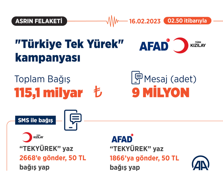 "Amacımız 1 yıl içinde, yıkılan her binanın yerine, insanımızın güvenle, huzurla oturabileceği konutları teslim etmeye başlamaktır. İnşallah el birliğiyle bu imtihanın da üstesinden geleceğiz. Dünkü Kabine Toplantısı'nda oradaki arkadaşlarımızla kendi aramızda 136 milyon 589 bin liralık bir yardım topladık. Bu meblağın içinde bizim katkımız da elbette var. Bugünkü kampanyada toplanacaklarla birlikte yurt içinden ve yurt dışından AFAD hesaplarına gelecek her kuruş, depremzedelerimiz için kullanılacaktır."
