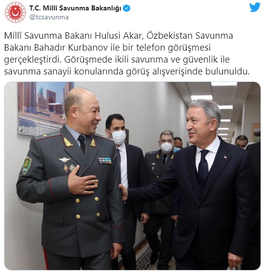 Türkiye ve Özbekistan arasında kritik temasMilli Savunma Bakanı Hulusi Akar, Özbekistan Savunma Bakanı Bahadır Kurbanov ile telefonda görüştü.05 Nisan 2021, Pazartesi - 19:15 Milli Savunma Bakanı Hulusi Akar, Özbekistan Savunma Bakanı Bahadır Kurbanov ile bir telefon görüşmesi gerçekleştirdi.Görüşmede ikili savunma ve güvenlik ile savunma sanayii konularında görüş alışverişinde bulunuldu.Bakan Fidan: Netanyahu hükümetinin Filistinlileri tehcir emelinin önüne set çekildiEtiketler: Türkiye Özbekistan Milli Savunma Bakanı Hulusi Akar