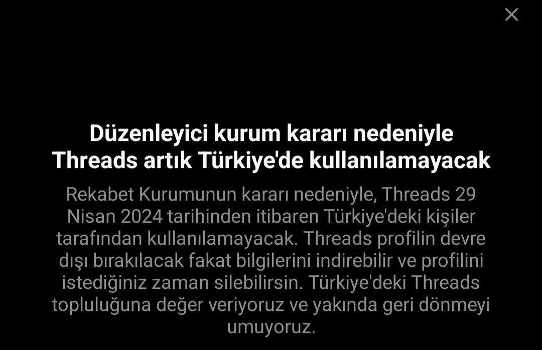 Türkiye’de Threads’i kullanan kişiler için oluşabilecek aksaklıkları en aza indirmek için gerekli adımların atıldığı belirtilerek "Türk Rekabet Kurumu’nun geçici tedbir kararı kapsamında, 29 Nisan Pazartesi gününden itibaren Threads’i Türkiye’de geçici olarak durduracağız. Türkiye’de topluluklarıyla Threads’de etkileşim kuranlar için bu kararın son derece üzücü olacağının farkındayız. Oluşabilecek aksaklıkları en aza indirmek için gerekli adımları atıyoruz" ifadesine yer verildi.