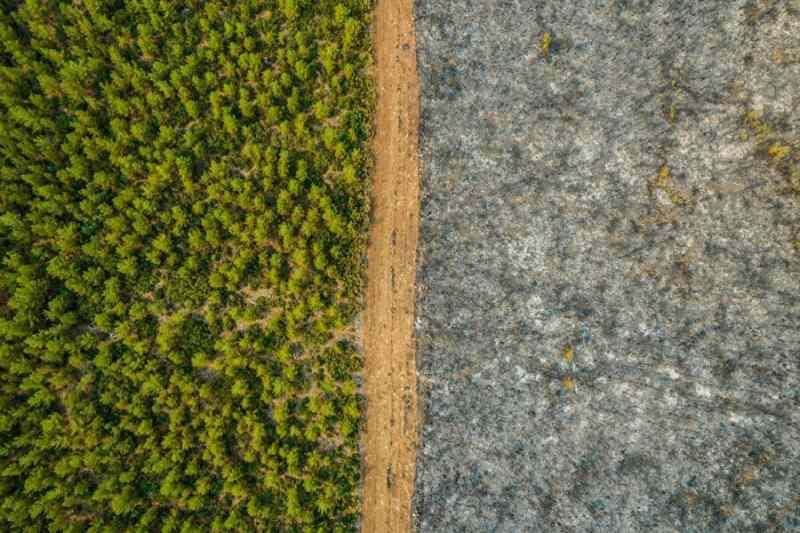 Menteşe'deki bu orman emniyet şeridi, alevlerin yolun diğer tarafına geçmesine engel olmuş. Yolun bir yanındaki ağaçlar küle dönmüşken, diğer taraf yemyeşil duruyor.