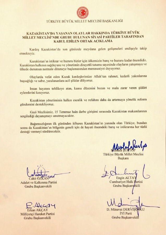 Kazakistan'ın istikrar ve huzuru bizler için ülkemizin barış ve huzuru kadar önemlidir. Kazakistan halkının sağduyusu ve yönetimin dirayetli tutumu sayesinde olayların yatışmaya ve ülkede durumun normale dönmeye başlamasından memnuniyet duyuyoruz.