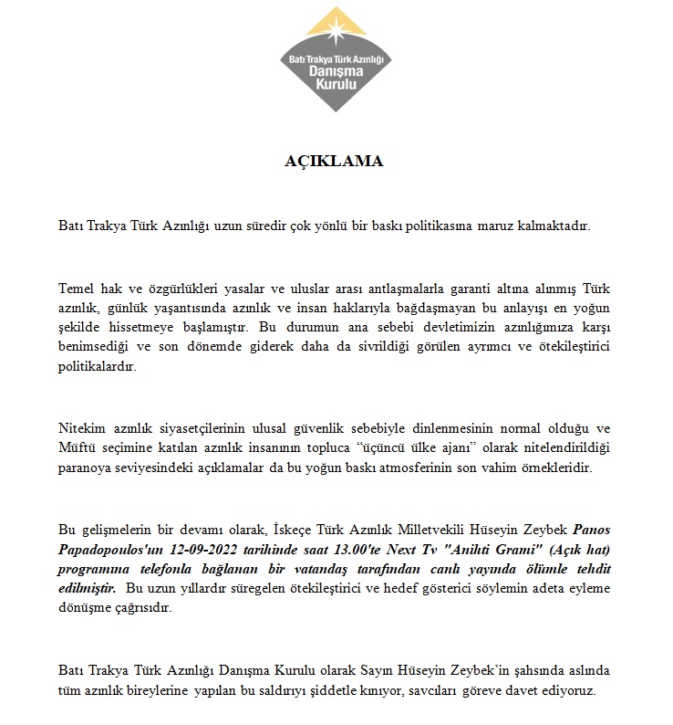 BTTA Danışma Kurulu yaptığı açıklamada, Batı Trakya Türk Azınlığı'nın uzun süredir çok yönlü bir baskı politikasına maruz kaldığını belirterek "İskeçe Türk Azınlık Milletvekili Hüseyin Zeybek, Panos Papadopoulus'un 12 Eylül'de Next Tv 'Anihti Grami'(Açık Hat) programına telefonla bağlanan bir vatandaş tarafından canlı yayında ölümle tehdit edilmiştir. Bu, uzun yıllardır süregelen ötekileştirici ve hedef gösterici söylemin adeta eyleme dönüşme çağrısıdır." denildi.