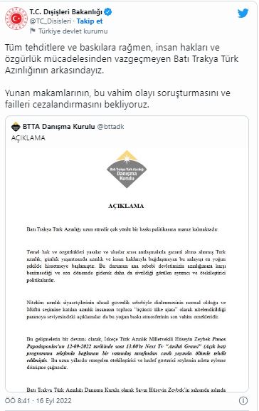 Dışişleri Bakanlığı, sosyal medya hesabı Twitter'dan, Batı Trakya Türk Azınlığı (BTTA) Danışma Kurulunun Twitter hesabından konuya ilişkin açıklamasını alıntılayarak "Tüm tehditlere ve baskılara rağmen insan hakları ve özgürlük mücadelesinden vazgeçmeyen Batı Trakya Türk Azınlığı'nın arkasındayız. Yunan makamlarının, bu vahim olayı soruşturmasını ve failleri cezalandırmasını bekliyoruz." ifadeleriyle Batı Trakya Türk Azınlığı'na destekte bulundu.