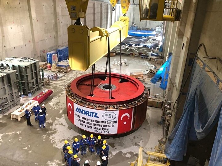 Artvin’in Yusufeli ilçesinde Çoruh Nehri üzerinde yapımı devam eden Yusufeli Barajı inşaatında gövde beton çalışmaları 275 metreye ulaşarak geçtiğimiz aylarda tamamlanmıştı. Baraj inşaat çalışmaları kapsamında elektromekanik teçhizat işleri de devam ederken, santral binasında her birinin kaldırma kapasiteli 230 ton olan 2 adet tavan vinci kullanılıyor. Ağır parçaların kaldırılmasında ise tavan vinçlerine 340 ton kaldırma kapasitesi olan kaldırma kirişi bağlanarak 2 vinç senkronize olarak çalışıyor. Ünite-1’e ait 300 ton ağırlığındaki Jeneratör Robotu 2 vinçin senkronize olarak çalıştırılmasıyla dev jeneratörün çalışacağı pitine indirildi. Bu işlemin görüntüleri DSİ 26. Bölge Müdürlüğü tarafından paylaşıldı.