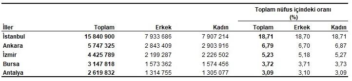 İstanbul'un nüfusu, bir önceki yıla göre 378 bin 448 kişi artarak 15 milyon 840 bin 900 kişi oldu. Türkiye nüfusunun %18,71'inin ikamet ettiği İstanbul'u, 5 milyon 747 bin 325 kişi ile Ankara, 4 milyon 425 bin 789 kişi ile İzmir, 3 milyon 147 bin 818 kişi ile Bursa ve 2 milyon 619 bin 832 kişi ile Antalya izledi.