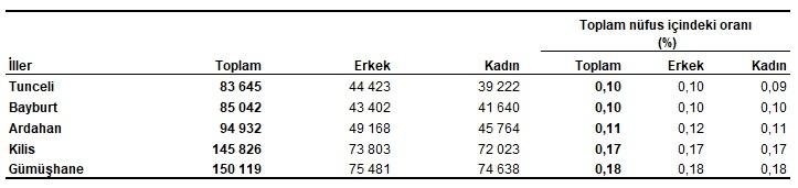 Tunceli, 83 bin 645 kişi ile en az nüfusa sahip olan il oldu. Tunceli'yi, 85 bin 42 kişi ile Bayburt, 94 bin 932 kişi ile Ardahan, 145 bin 826 kişi ile Kilis ve 150 bin 119 kişi ile Gümüşhane takip etti.