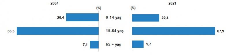 Çalışma çağı olarak tanımlanan 15-64 yaş grubundaki nüfusun oranı, 2007 yılında %66,5 iken 2021 yılında %67,9 oldu. Diğer yandan çocuk yaş grubu olarak tanımlanan 0-14 yaş grubundaki nüfusun oranı %26,4'ten %22,4'e gerilerken, 65 ve daha yukarı yaştaki nüfusun oranı ise %7,1'den %9,7'ye yükseldi.