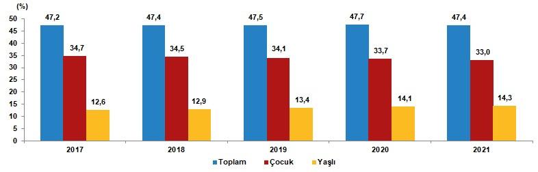 Ekonomik olarak aktif olan birey başına düşen çocuk sayısını ifade eden çocuk bağımlılık oranı, %33,7'den, %33'e gerilerken, çalışan birey başına düşen yaşlı birey sayısını ölçen yaşlı bağımlılık oranı ise %14,1'den %14,3'e yükseldi. Diğer bir ifadeyle, Türkiye'de 2021 yılında, çalışma çağındaki her 100 kişi, 33 çocuğa ve 14,3 yaşlıya bakmaktadır.