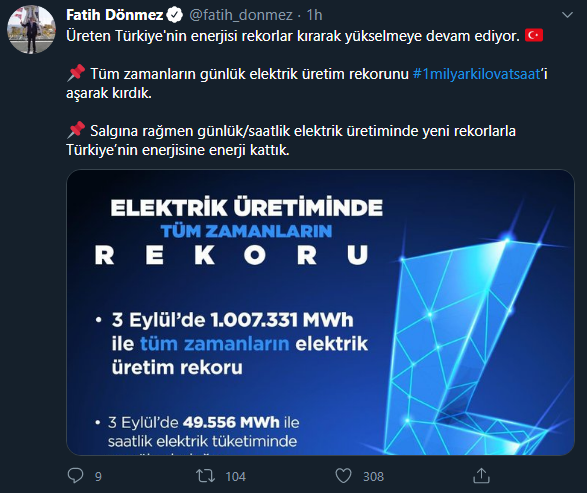 Dönmez yaptığı paylaşımda, "Salgına rağmen günlük/saatlik elektrik üretiminde yeni rekorlarla Türkiye’nin enerjisine enerji kattık." ifadelerine yer verdi.