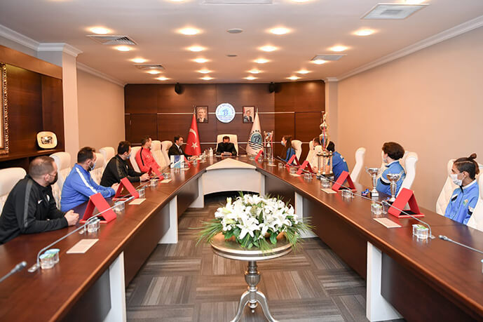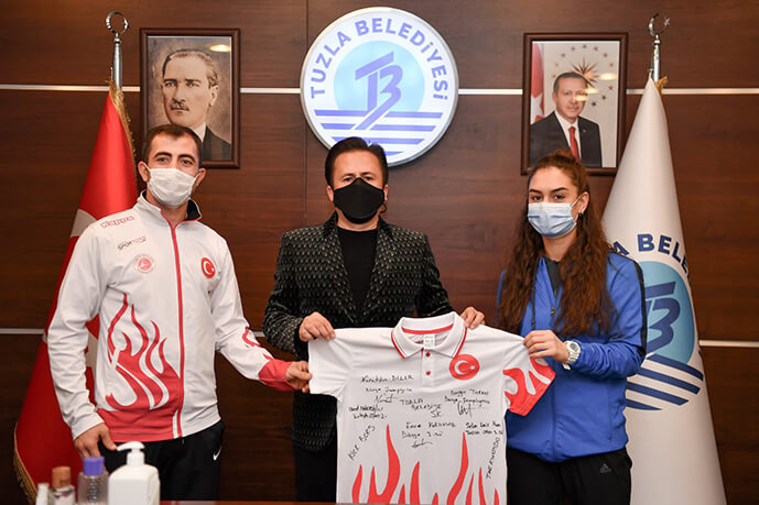 Yeni tip koronavirüs salgını kapsamında alınan tedbirler ile, Tuzla Belediyesi Ana Hizmet Binası'nda 5 lisanslı sporcu ve 4 antrenörle bir araya gelen Tuzla Belediye Başkanı Dr. Şadi Yazıcı, dereceye girmeyi başaran 40 sporcuya temsili ödüllerini verdi.