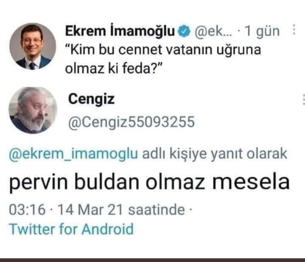 Ekrem İmamoğlu bir yandan terör sevicilerle poz verirken diğer yandan da vatanseverlik naraları attığı bir paylaşım daha yaptı. CHP'li İmamoğlu, 'Kim bu cennet vatanının uğruna olmaz ki feda?' mesajını paylaştı. Mesaja cevap veren bir vatandaş ise 'Pervin Buldan olmaz mesela' diyerek İmamoğlu'na tepki gösterdi.