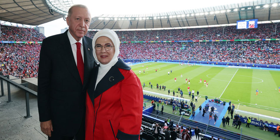 Cumhurbaşkanı Recep Tayyip Erdoğan ve eşi Emine Erdoğan, 2024 Avrupa Futbol Şampiyonası (EURO 2024) çeyrek finalinde Hollanda ile Türkiye'nin Berlin Olimpiyat Stadyumu’ndaki karşılaşmasını statta canlı izledi.