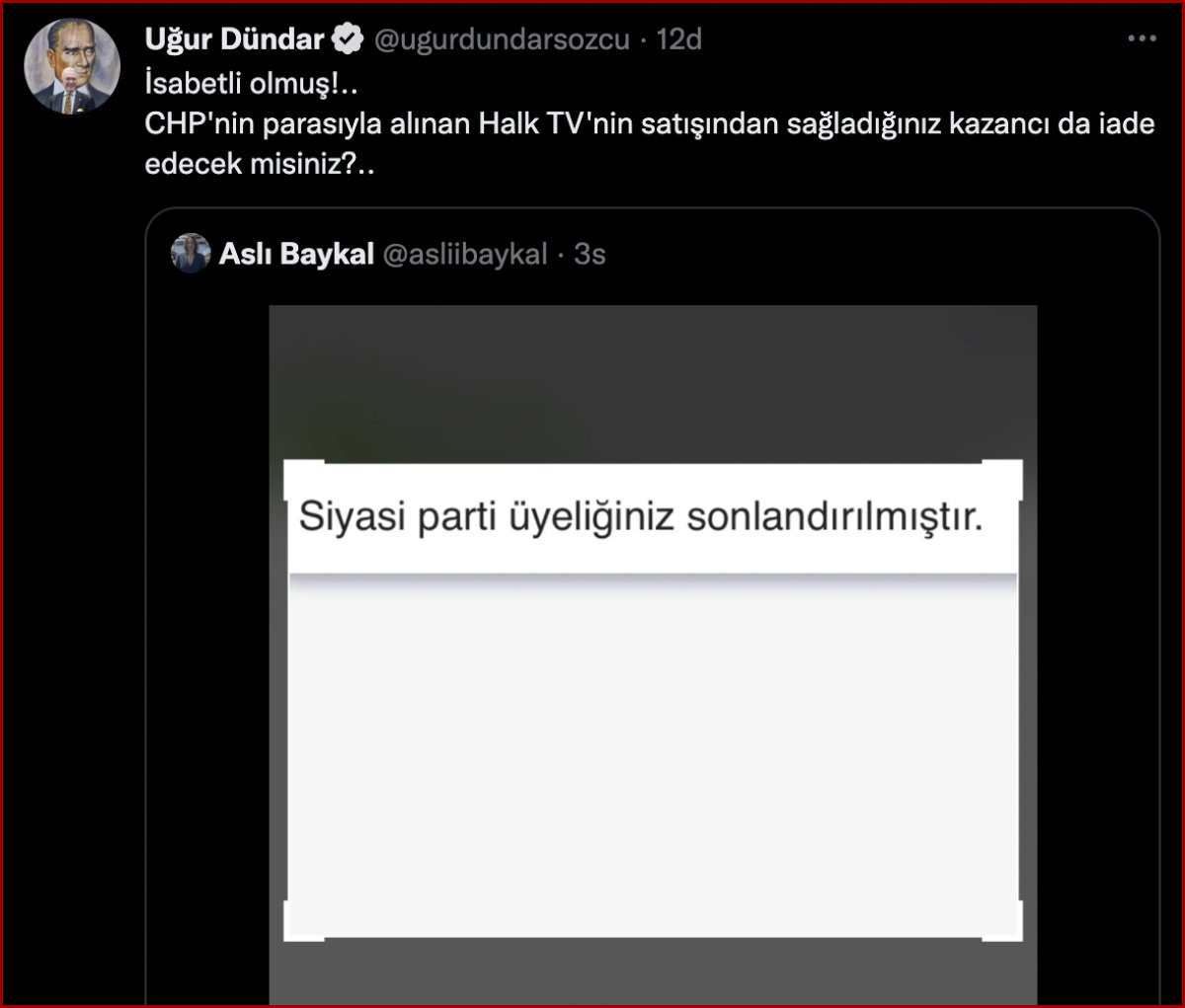 Dündar ise, Baykal Ailesi'ni, Halk TV'yi CHP'nin parasıyla almakla suçlamıştı. Dündar, bu kavgada adeta yeni bir sayfa araladı. Baykal'ın istifa tweet'ini alıntılayan Dündar, Baykal'a Halk TV'nin satışından elde ettiği kazancı sordu.