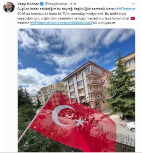 Ukrayna Ankara Büyükelçisi Vasly Bodnar, sosyal medya hesabından yaptığı paylaşımda 15 Temmuz Demokrasi ve Milli Birlik Günü’nü kutlayarak, "Bugüne kadar sakladığım bu bayrağı özgürlüğün sembolü olarak 15 Temmuz 2016’da İstanbul’da bana bir Türk vatandaşı hediye etti.