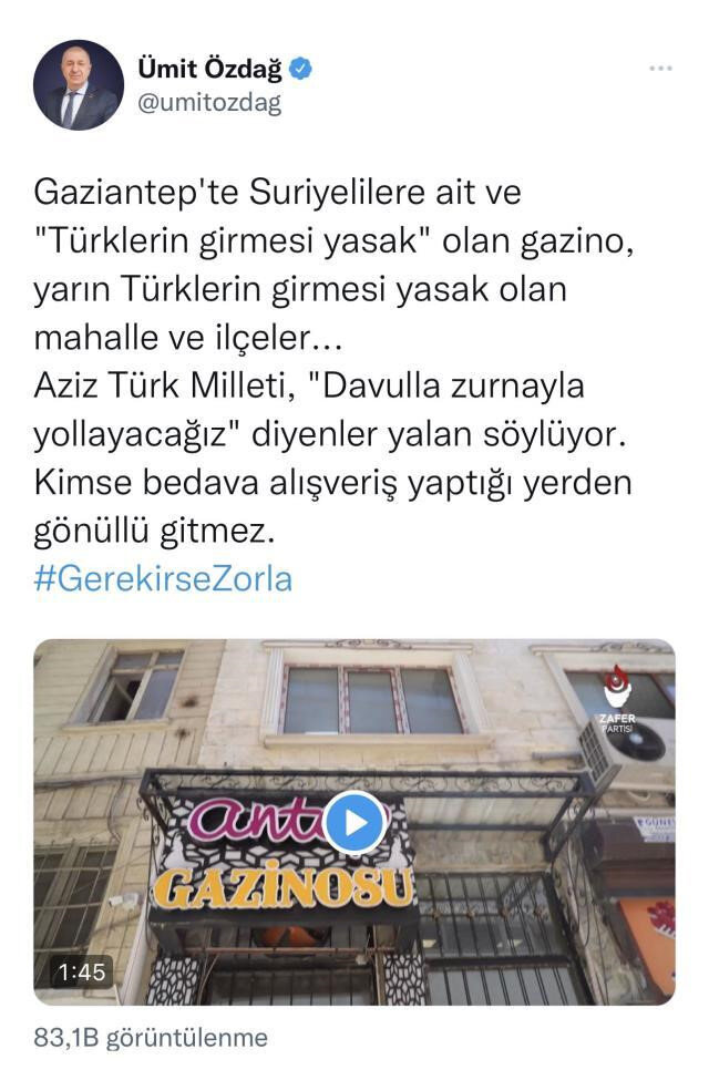 Suriyeli sığınmacılarla ilgili sürekli yanlış bilgiler vererek halkı kışkırtmaya çalışan Zafer Partisi lideri Ümit Özdağ, dün Gaziantep'te Suriyelilere ait olduğunu iddia ettiği gazinonun önüne giderek video çekti. Twitter hesabından videosunu paylaşan Özdağ, gösterdiği binaya Türklerin girmesinin yasak olduğunu öne sürdü.