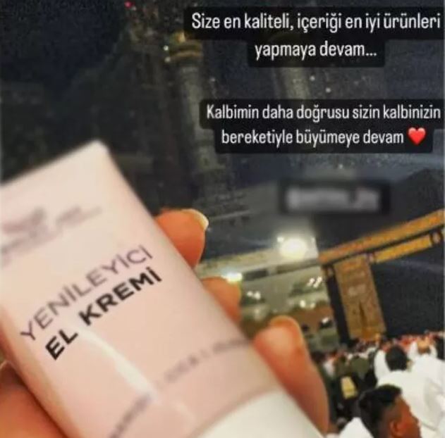 “Allah her isteyene nasip etsin inşallah. İnsanın gönlüne buranın sevdası düşünce, ne iş dinliyor ne başka bir şey. Hem dualarımdan eksik olmayan ve Allah’a emanet ettiklerim var. Onlara bol bol dua ettim, arayabildiklerimi aradım. Bir de Allah’a havale ettiklerim var tabii" diyerek yaptığı paylaşımla dikkat çeken Aslı Şen daha sonra ise fona Kabe'yi alarak markasının reklamını yaptı.